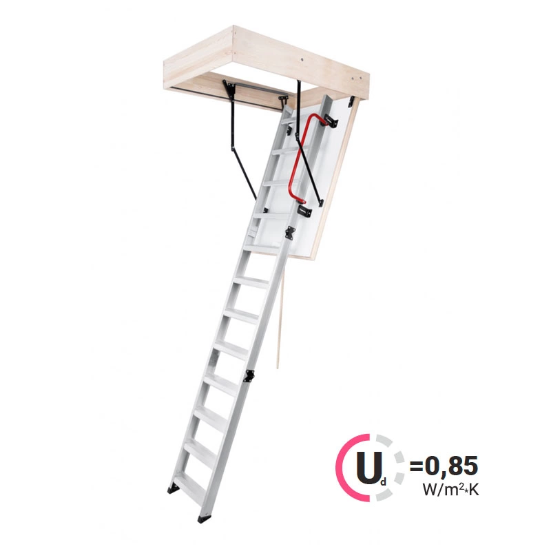Противопожарная лестница, огнестойкость EI 60 Лестница чердачная складная металлическая 3-х секционная. Ступени полностью выполнены из металла и покрашена порошковой краской. Термоизоляционная крышка типа “сэндвич “, толщиной 66мм, утеплена пенопластом , облицована с двух сторон ДВП белого цвета. Короб деревянный высотой 170мм. Лестница имеет 3 уплотнителя, один проходит по периметру короба, и два по периметру крышки люка, в том числе и противопожарный.