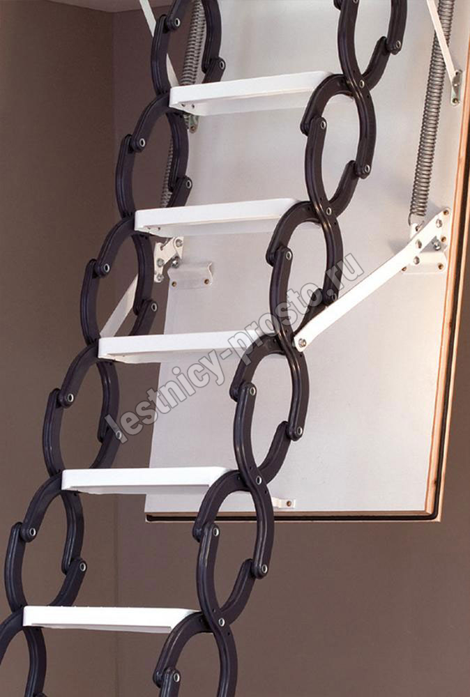 Все металлические элементы, петли, пружины, кронштейны, ручка, стальные ступени обработаны и защищены порошковым покрытием, оберегающим лестницу от механических повреждений при частом использовании.
