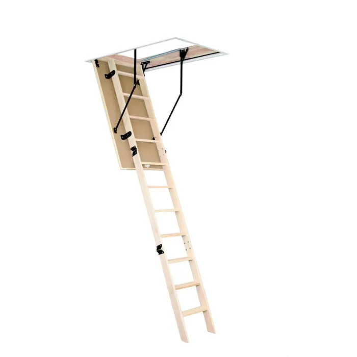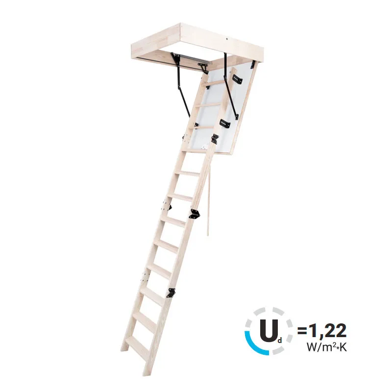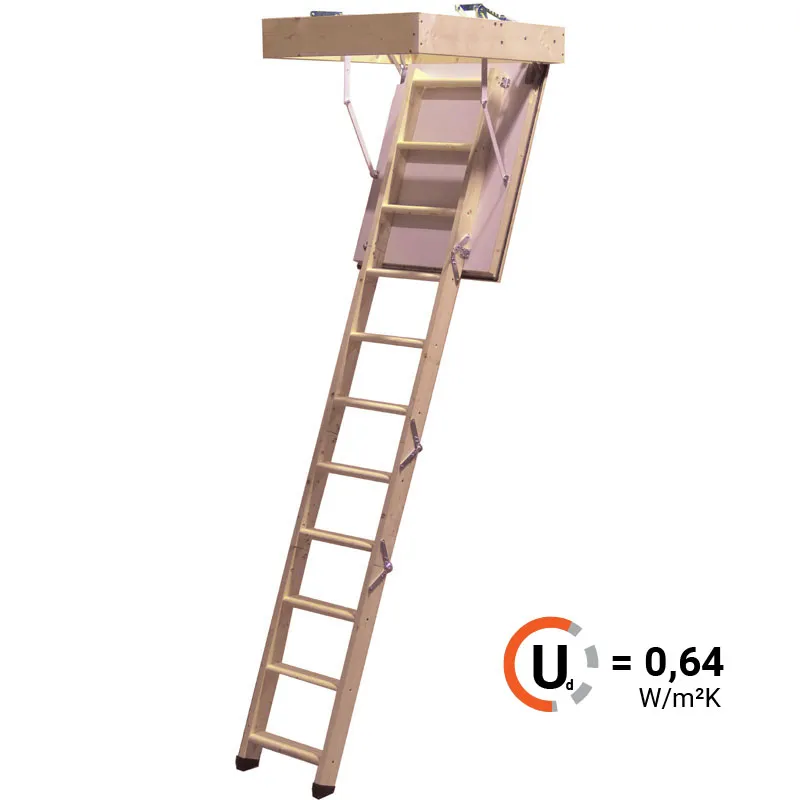 Лестница складная трёхсекционная, изготовлена из сосны. Термоизоляционная крышка типа "сэндвич" утеплена пенопластом, облицована с двух сторон ДСП белого цвета. Короб люка с однослойным уплотнителем. Все металлические элементы лестницы покрыты порошковой краской, ступени лестницы имеют антискользящие насечки и закреплены в столярное соединение «ласточкин хвост», что позволяет выдерживать нагрузку  до 150 кг. Деревянный стержень для открывания лестницы в комплекте.