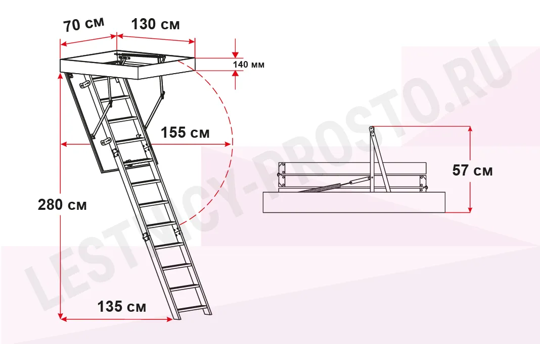 Лестница складная трёхсекционная, изготовлена из сосны. Термоизоляционная крышка типа "сэндвич" утеплена пенопластом, облицована с двух сторон ДСП белого цвета. Короб люка с однослойным уплотнителем. Все металлические элементы лестницы покрыты порошковой краской, ступени лестницы имеют антискользящие насечки и закреплены в столярное соединение «ласточкин хвост», что позволяет выдерживать нагрузку до 150 кг. Деревянный стержень для открывания лестницы в комплекте.
