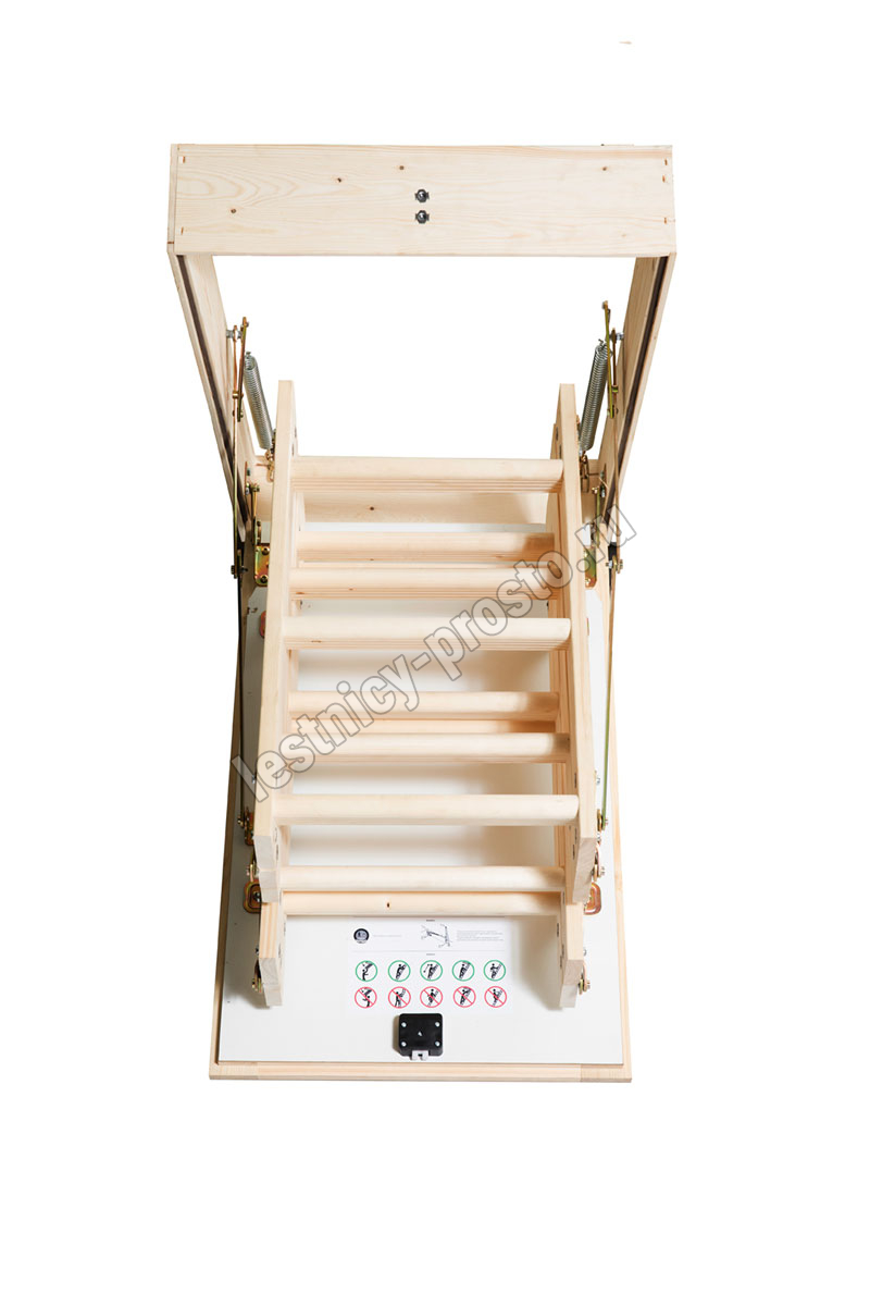 В комплекте: люк из сэндвич-панели, пружинный механизм "короб-рычаг", короб, четырехсекционная лестница с буковыми ступенями, замок люка, штанга для раскладывания лестницы, наконечники для ножек