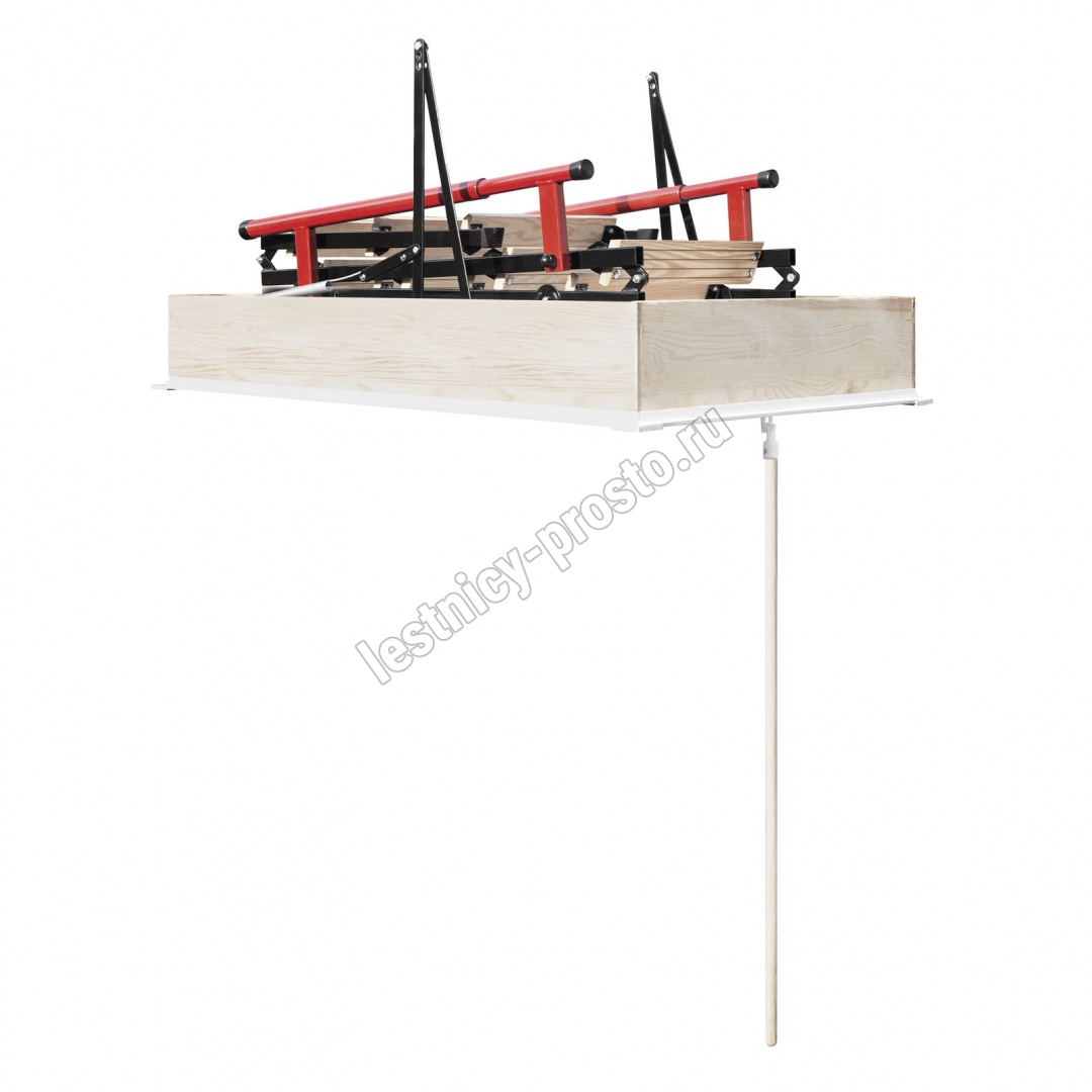 Лестница чердачная, складная, комбинированная 3-х секционная, металлические направляющие/деревянные ступени. Короб люка имеет двухточечную систему запирания. Телескопический поручень имеет внутреннюю пружину и при складывании лестницы служит механическим приводом, что облегчает процесс. Делает его полуавтоматическим. Оборудована дополнительной ступенькой на люке помогающей комфортно подниматься и спускаться. Термоизоляционная крышка типа "сэндвич", толщиной 86мм, утеплена пенопластом, облицована с двух сторон ДВП белого цвета. Лестница подходит для установки в местах с большими перепадами температур. Короб деревянный, высотой 170мм., по периметру проходит уплотнитель. Лестница выпускается для немецкого и английского рынка.