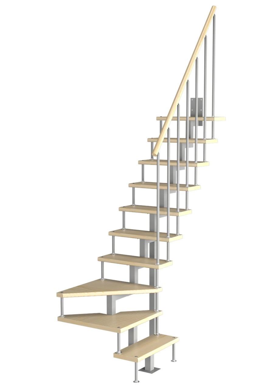 Удобная лестница на косоурах с поворотом на 90 градусов. Открытые ступени визуально облегчают конструкцию. Ограждения по всему маршу обеспечивают дополнительную безопасность и возможность декорирования. Монтаж осуществляется силами двух человек на объекте по указаниям, приведенным в паспорте на лестницу.