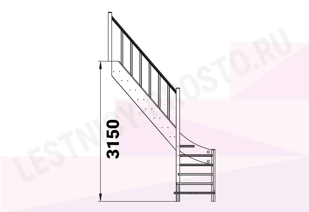 Ступени и поручень лестницы изготовлены из дуба, остальные элементы из сосны. Возможно изготовление данной модели полностью из дуба. Базовый комплект включает в себя деревянные элементы лестницы и ограждения без какого-либо покрытия.