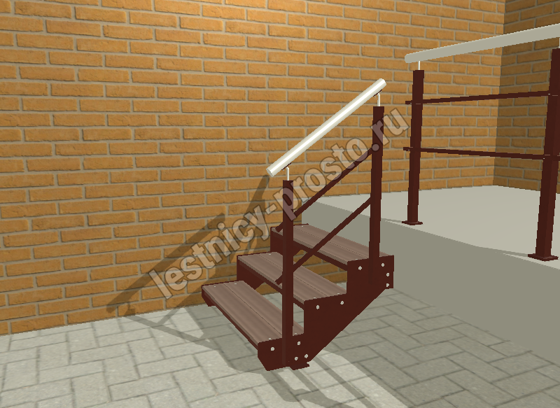 Ступени лестницы состоят из металлической рамки, обеспечивающей необходимую прочность, и покрытия из террасной доски ДПК (древесно-полимерный композит). Ступени не боятся воды и мороза, не теряют со временем свой внешний вид и не требуют ухода.