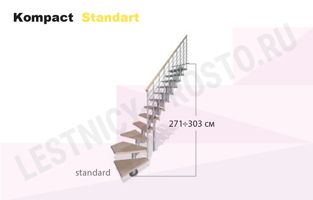 Красивая комфортная лестница с уникальной модульной конструкцией, которая позволяет собрать большое число модификаций, подходящих под ваш проём и другие условия помещения. Возможные варианты сборки лестницы смотрите в блоке "чертежи и схемы". При монтаже модульной лестницы KOMPACT, вы можете варьировать высоту шага и проступь, получив точную необходимую высоту и габариты. Ступени выполнены из массива бука и покрыты качественным износостойким лаком. Базовая комплектация позволяет получить лестницу под высоты этажа в диапазоне 2250 - 3030 мм, кроме того, установив дополнительный комплект увеличения высоты, можно поднять высоту лестницы до 3730 мм. Каркас и стойки ограждения выполнены из пластифицированного металла.