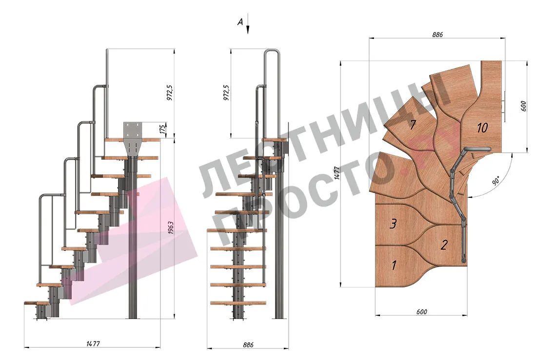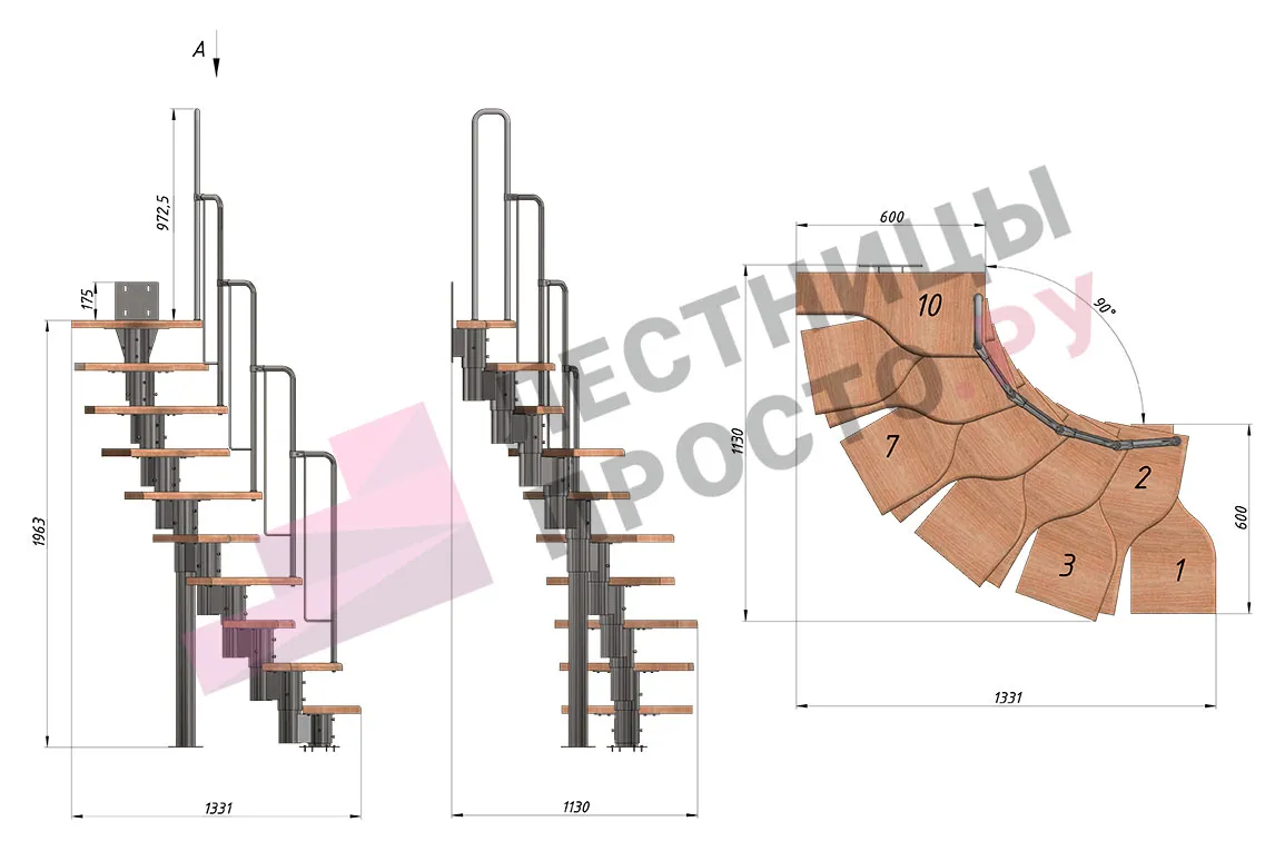 | Лестница Prosto Urban Grey г-образная гусиный шаг 600 мм, h180-264 см (10 ступеней) |