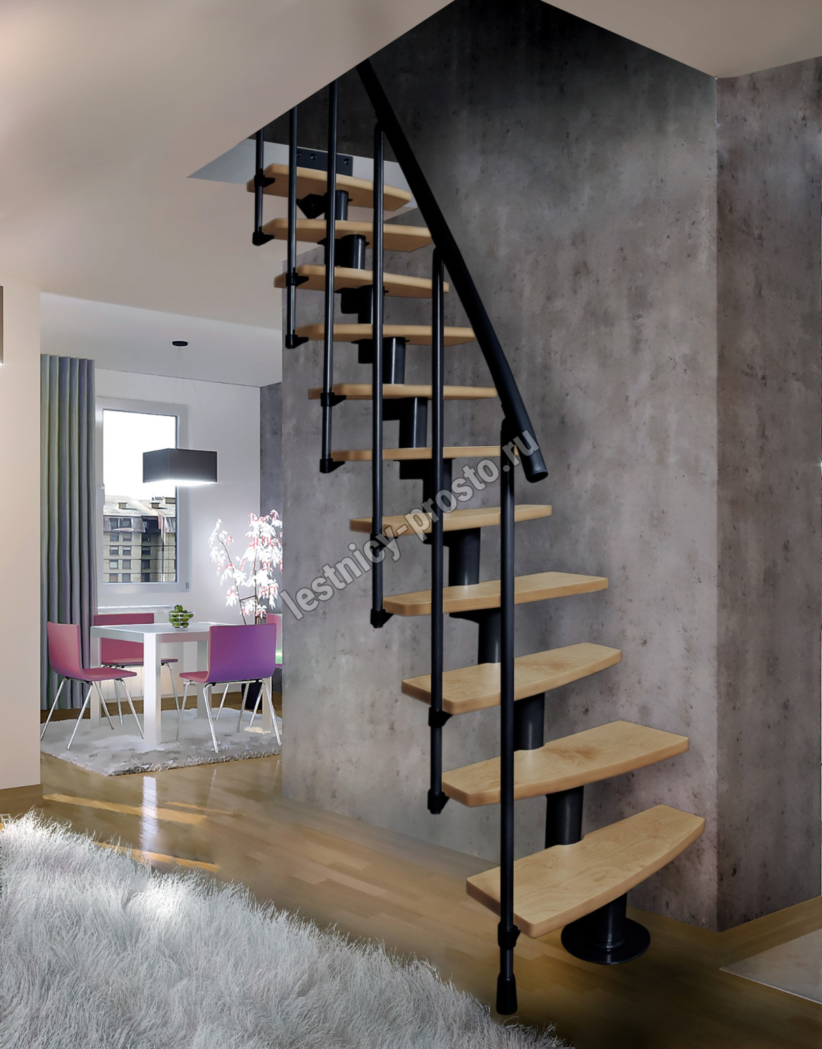 С помощью дополнительных секций(покупаются отдельно) можно увеличить высоту лестницы до 3750 мм. Модульный каркас лестницы позволяет собрать конструкцию, как прямую так и с необходимым небольшим поворотом в нужную сторону, благодаря чему эта модель идеально подходит для помещений с ограниченным пространством, где установка стандартных лестниц невозможна.