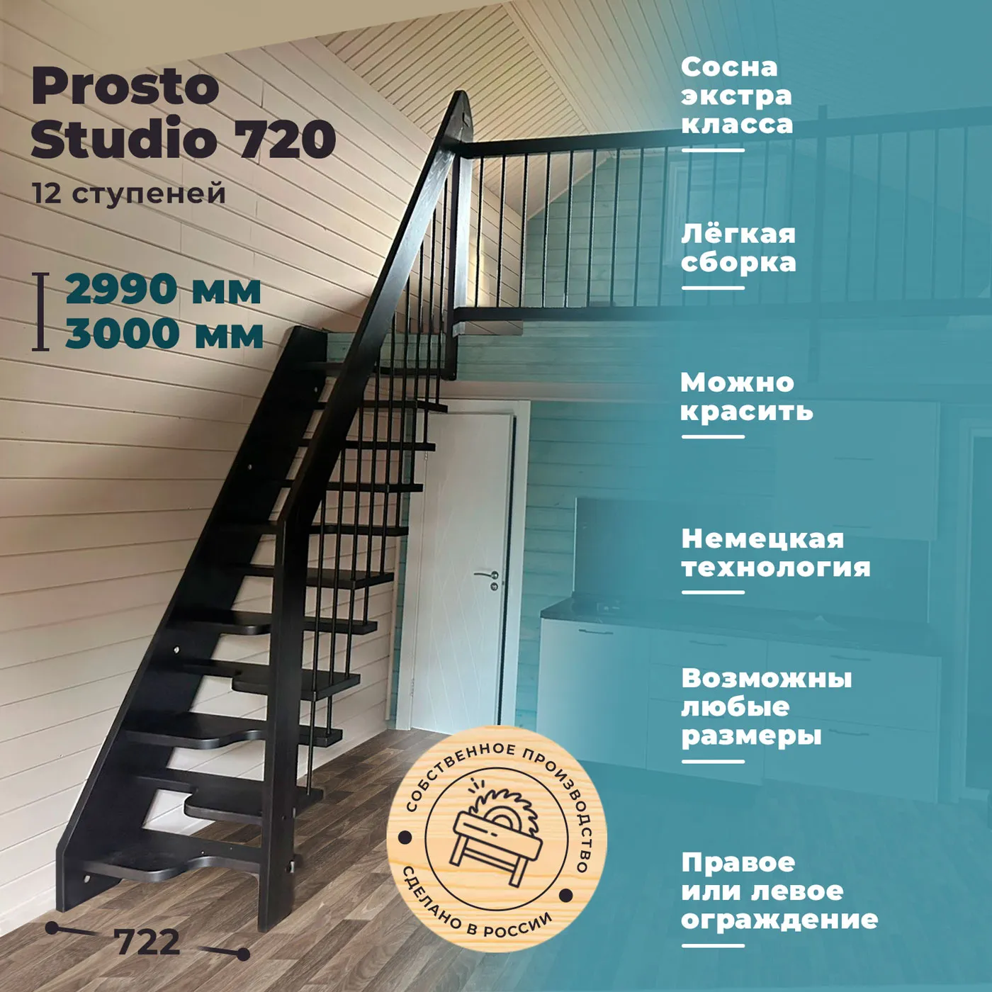 Модульная лестница Спринт 225 2925-3055, Черный, Сосна, Крашеная, Без Ступений