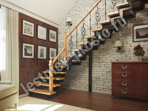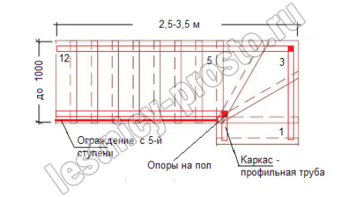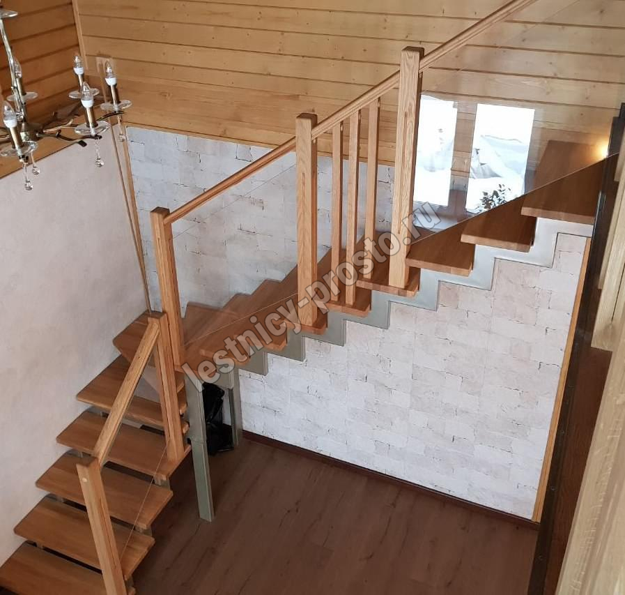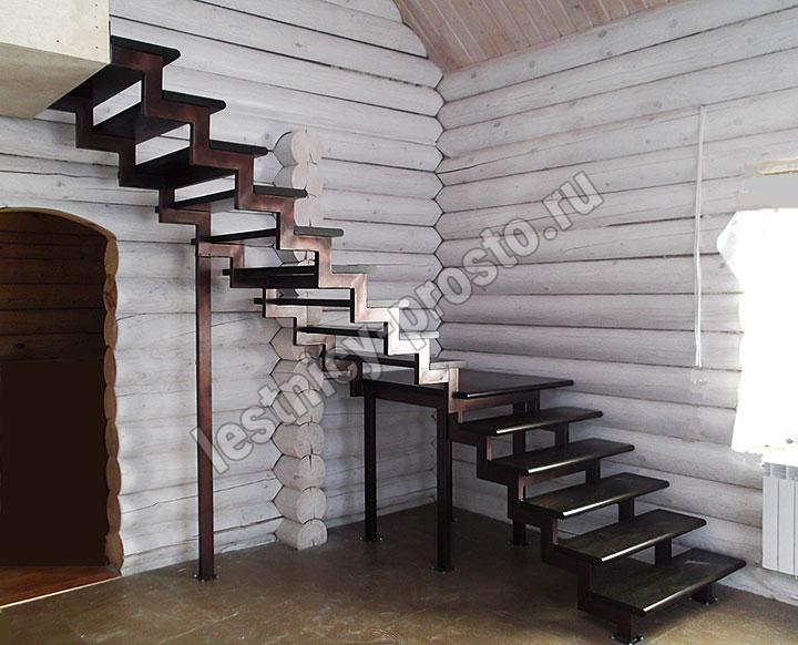 У данного варианта лестницы поворот реализован через забежные ступени. Под заказ возможно изготовление каркаса под поворотную площадку.
