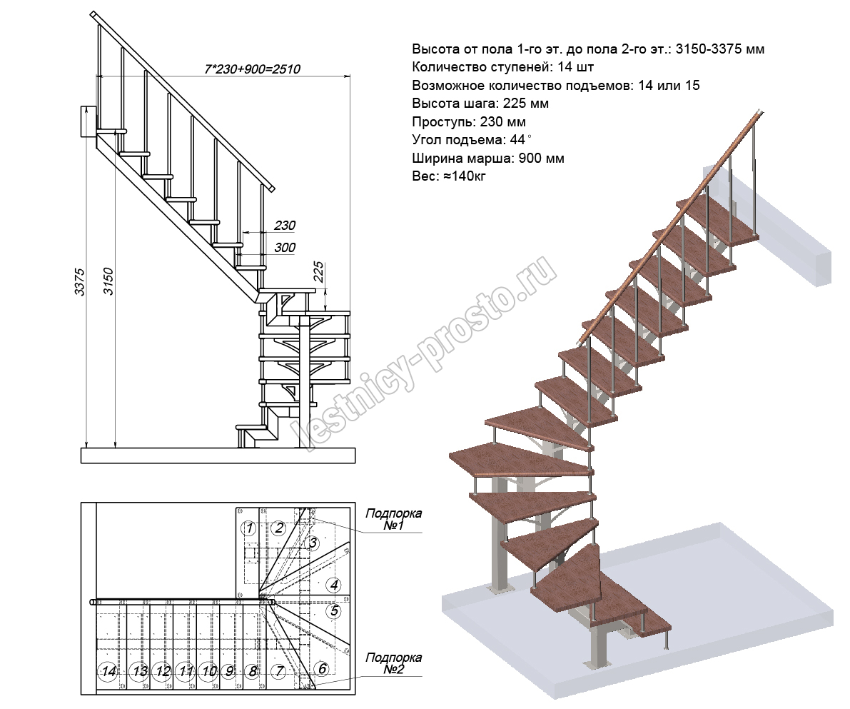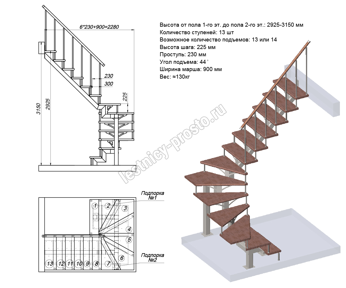 | Лестница PROSTO MONO П-образная, h225 см, ступени хвоя |