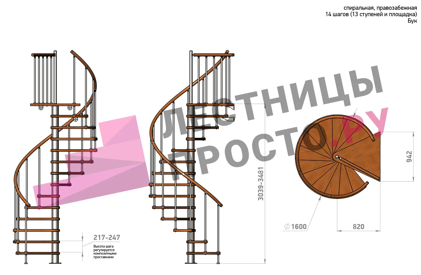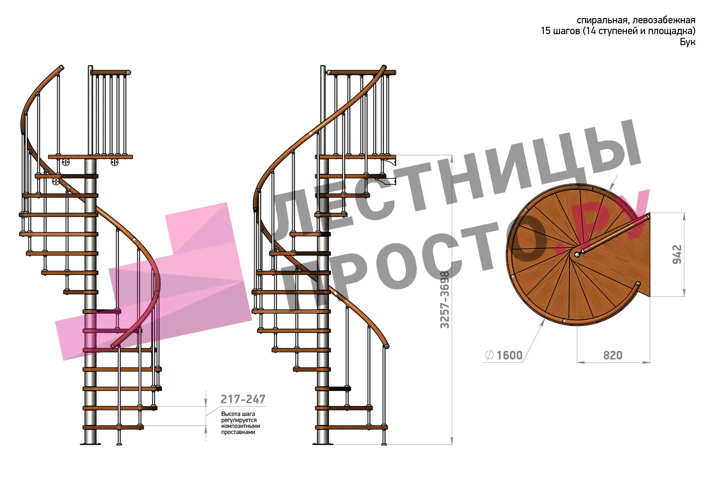 | Винтовая лестница Prosto Spiral Black D140см, h260.5-304.6 см, бук |