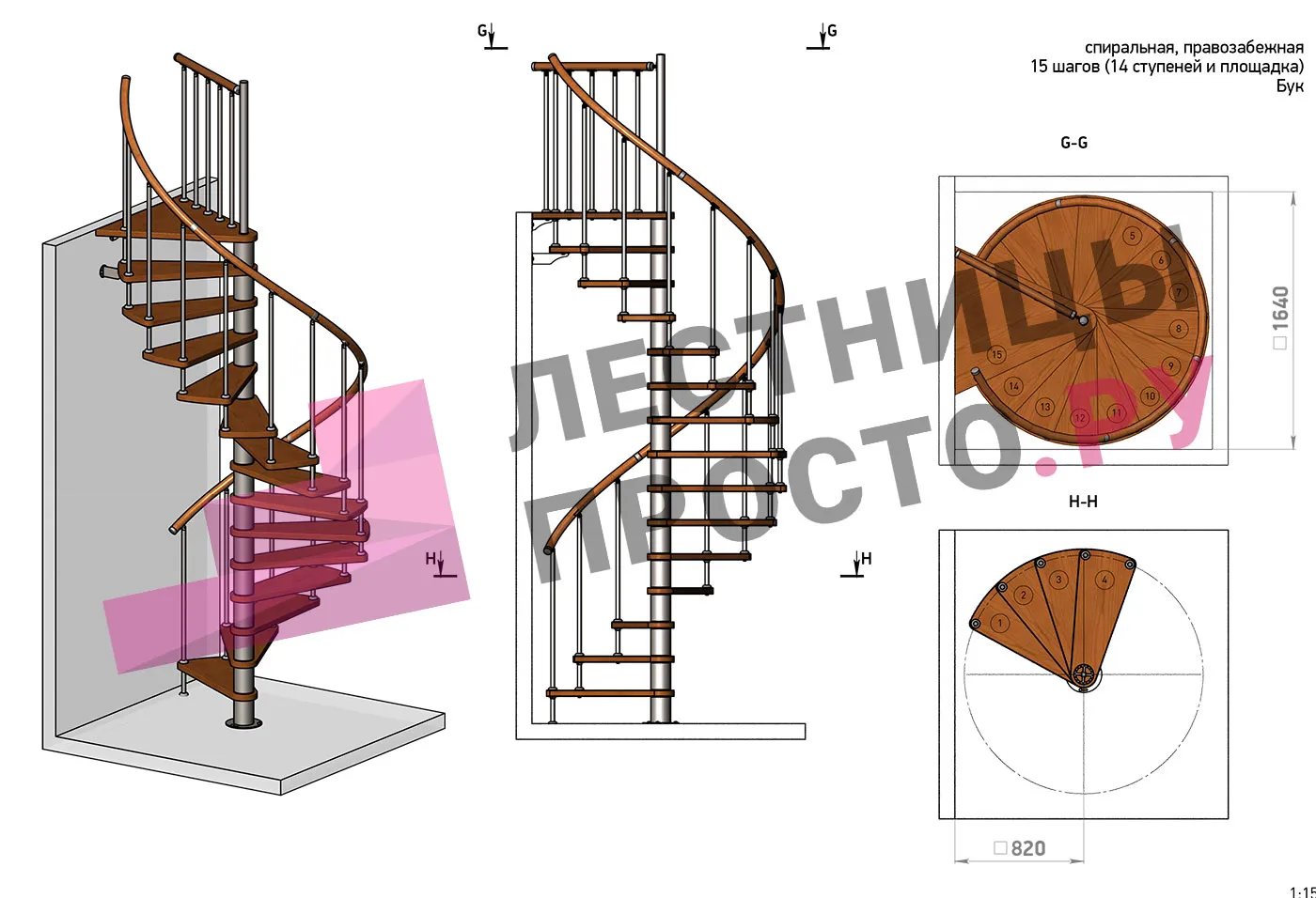 | Винтовая лестница Prosto Spiral Black D160см, h282.2-326,3 см, бук |