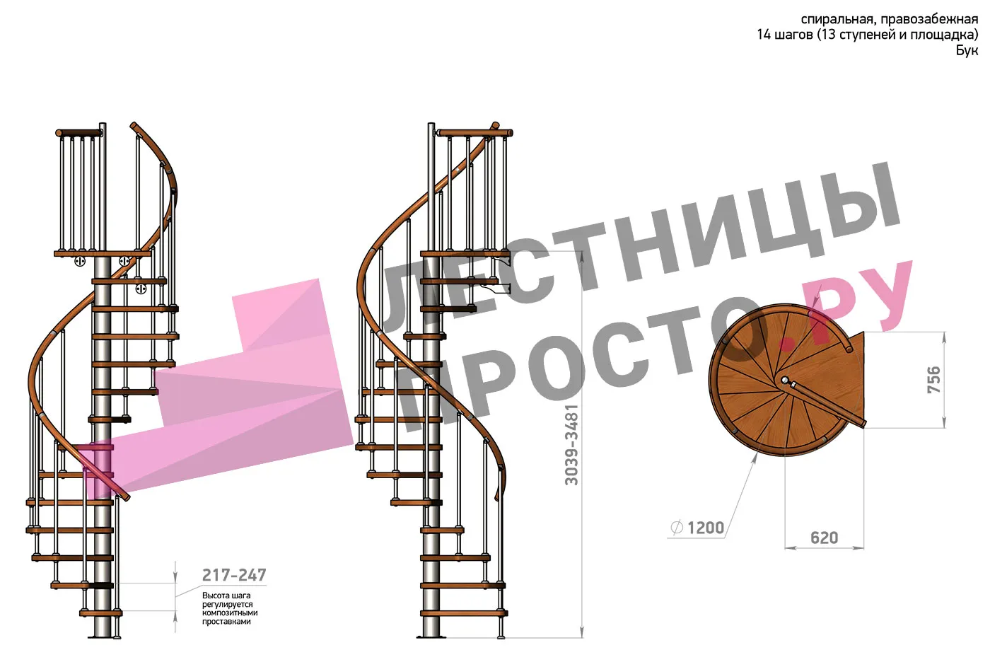 Правая, d=120см, 14 ступеней + площадка