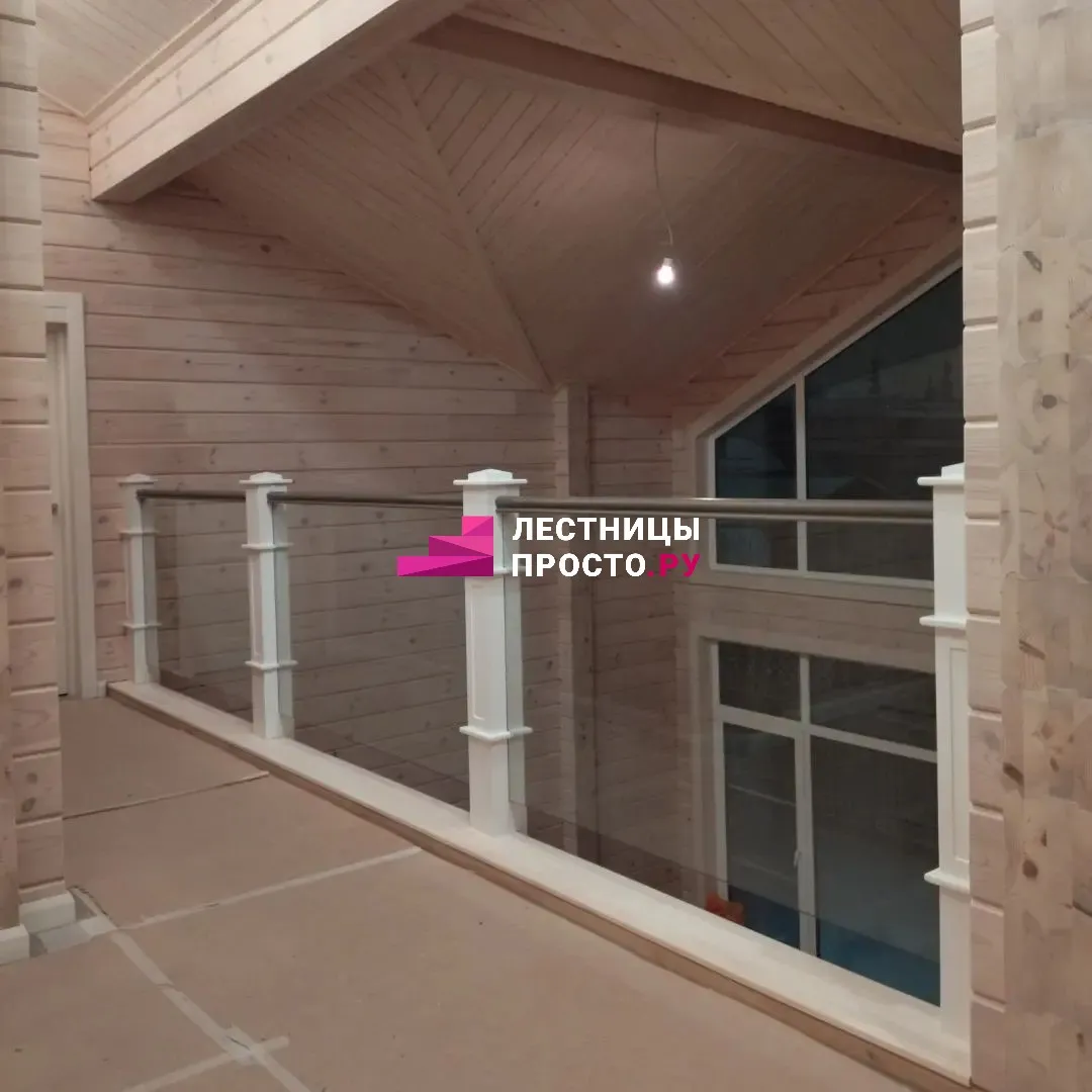 Деревянная лестница с площадкой на мансарду с дополнительной балюстрадой из стекла LP-1-17