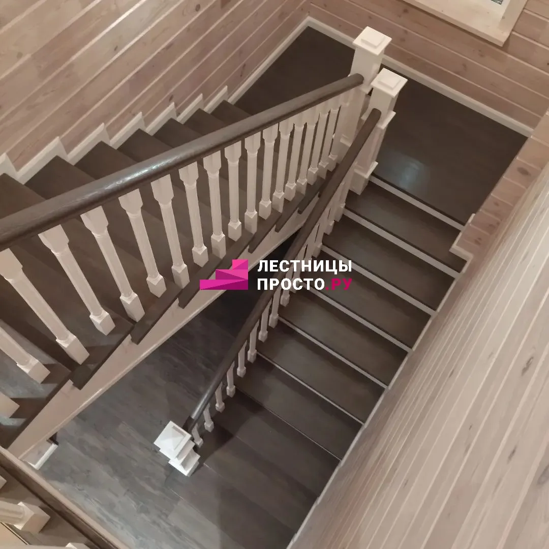 Деревянная лестница с поворотом из сосны для частного дома